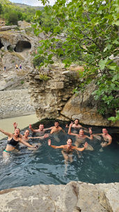 Iniciamos la jornada con el descenso del barranco de Benjës. La aproximación desde la iglesia ortodoxa del pueblo nos dejará en una garganta excavada en roca estratificada, con preciosas formaciones que nos acompañarán a lo largo del recorrido. Durante el descenso disfrutaremos de saltos naturales, toboganes, pasillos estrechos esculpidos por el agua y pozas cristalinas que invitan al baño en pleno corazón del cañón. Al finalizar la actividad, en la parte baja del barranco, nos esperará uno de los mayores atractivos del día: las famosas aguas termales de Benjës. Allí podremos relajarnos junto al pintoresco puente de Kadiu, una construcción otomana que añade un toque histórico a esta jornada.